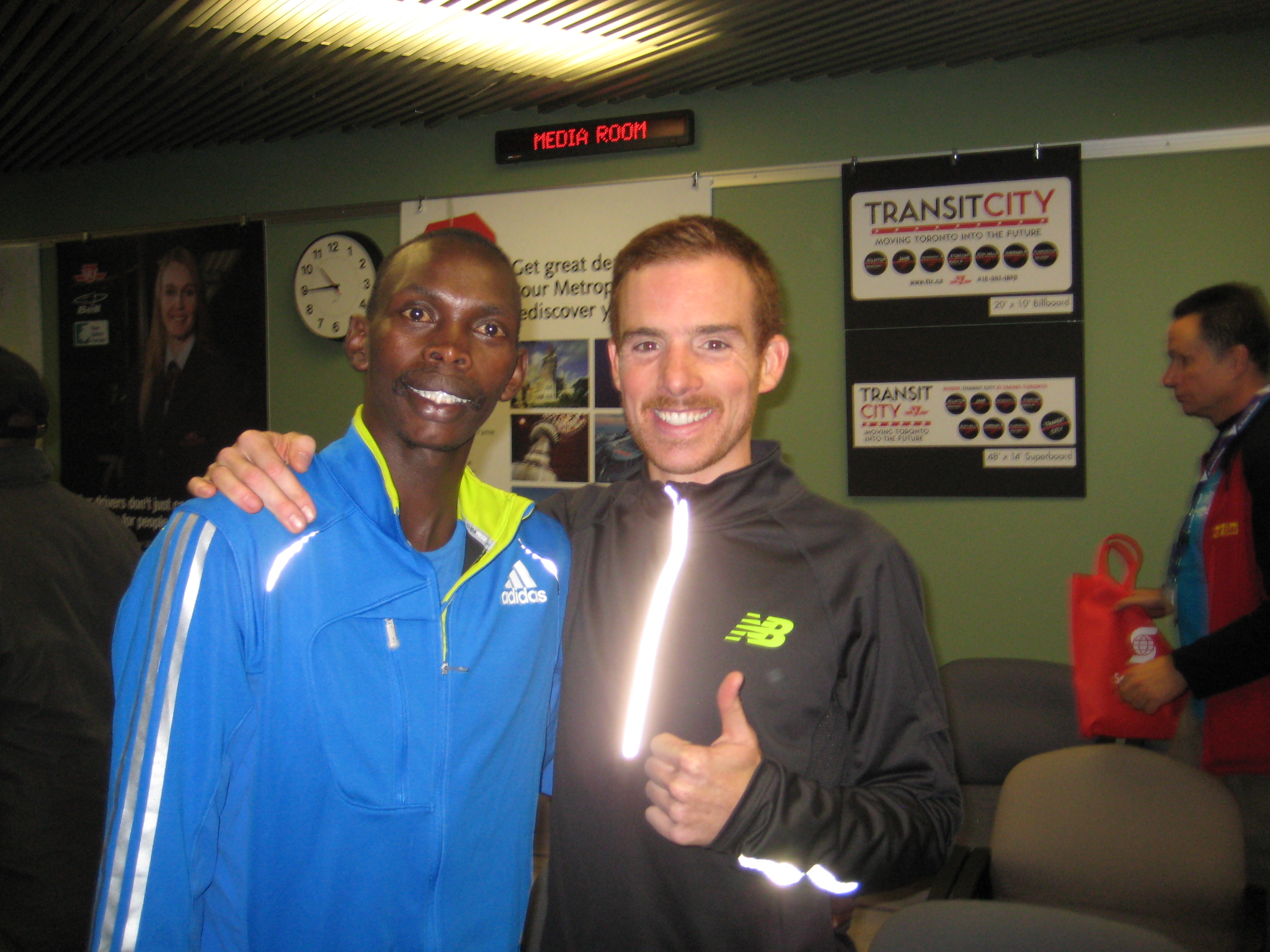 There are so many people I’d like to thank because they helped make my result possible. My coach, Dave Scott-Thomas, was obviously a huge part of the equation as was my training partner Eric Gillis who ran 2:12:07 yesterday in the marathon. Hopefully next marathon we’ll actually work together in the race too. Rob Watson did an amazing job as a pacer and kept the other pacer, Simon Tanui in line. We had a good support crew for many of our road workouts who handed us water bottles (Cal, Moulton, Rob, Lee). Trent Stellingwerff who is my nutrition/fuelling coach. Speed River dudes, Josephat, Karanja, Paul Felix and and everyone else accompanying me through the training. My physical therapy support group is top notch… Brenda Scott-Thomas, Marcell Meresz, Dr. Galvin, Dr. Mountjoy, Lance, Jay Ball, Gloria and Sue from McMaster, Dr. Kvedaras, Dr. Gamble and Ron O’Hare who helped us through the race weekend. My parents, family and friends for the support. It was great having them and everyone else who was cheering for me on the course. Alan Brookes and Ian Ladbrooke put together a great event and made sure we had a good set-up to run fast. Inspiration and advice from great marathoners such as Gord Dixon, Sylvia Reugger, Bruce Deacon and Jon Brown. New Balance has been a great sponsor. PowerBar (kept me fuelled during the marathon), CEP socks, Zanagen (I’ll be using the anti-inflamatory cream today!) and Quest for Gold.