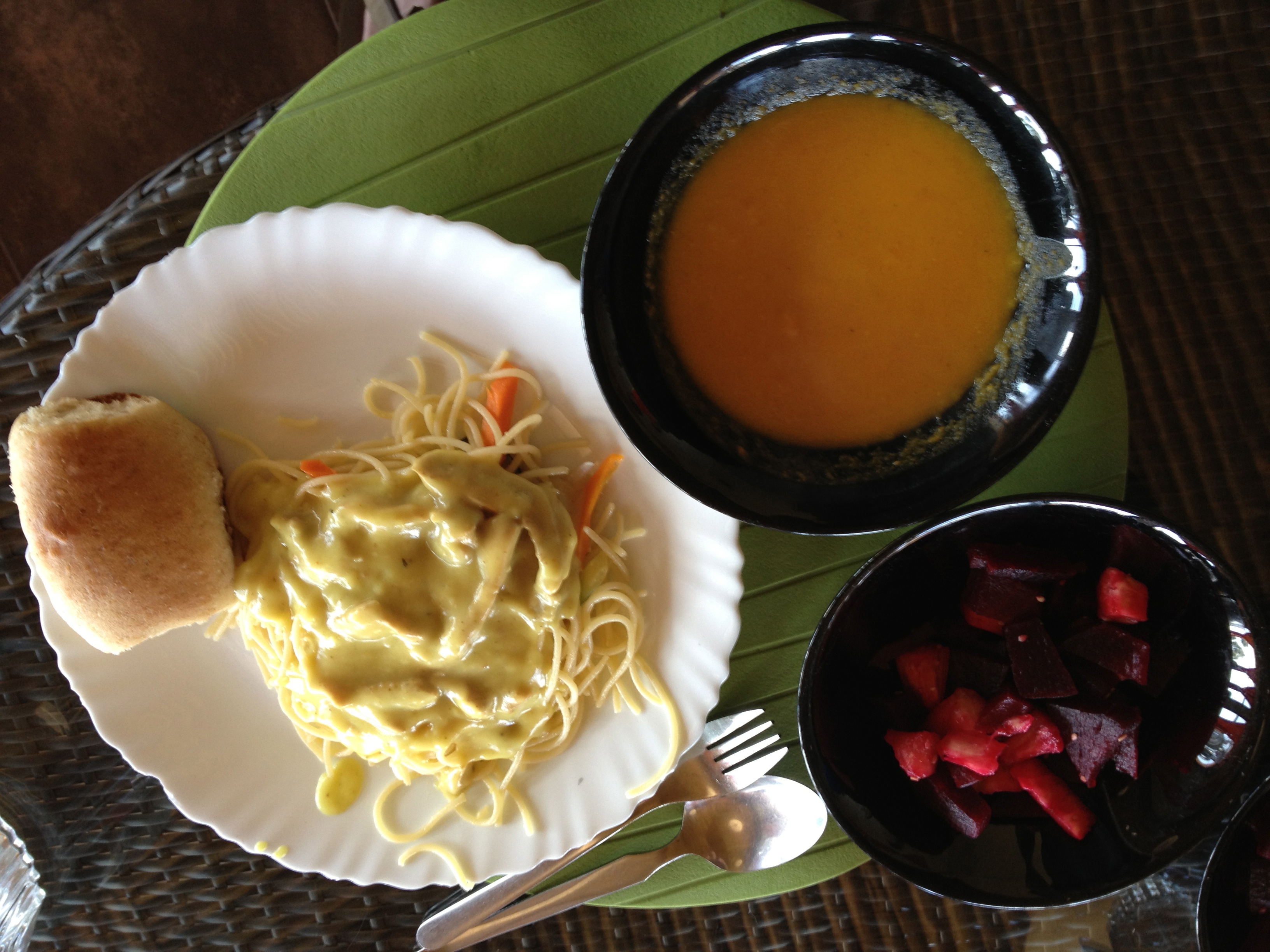 On this day we had pasta with chicken carbonara sauce, squash soup, rolls and the beetroot pineapple salad mentioned above.