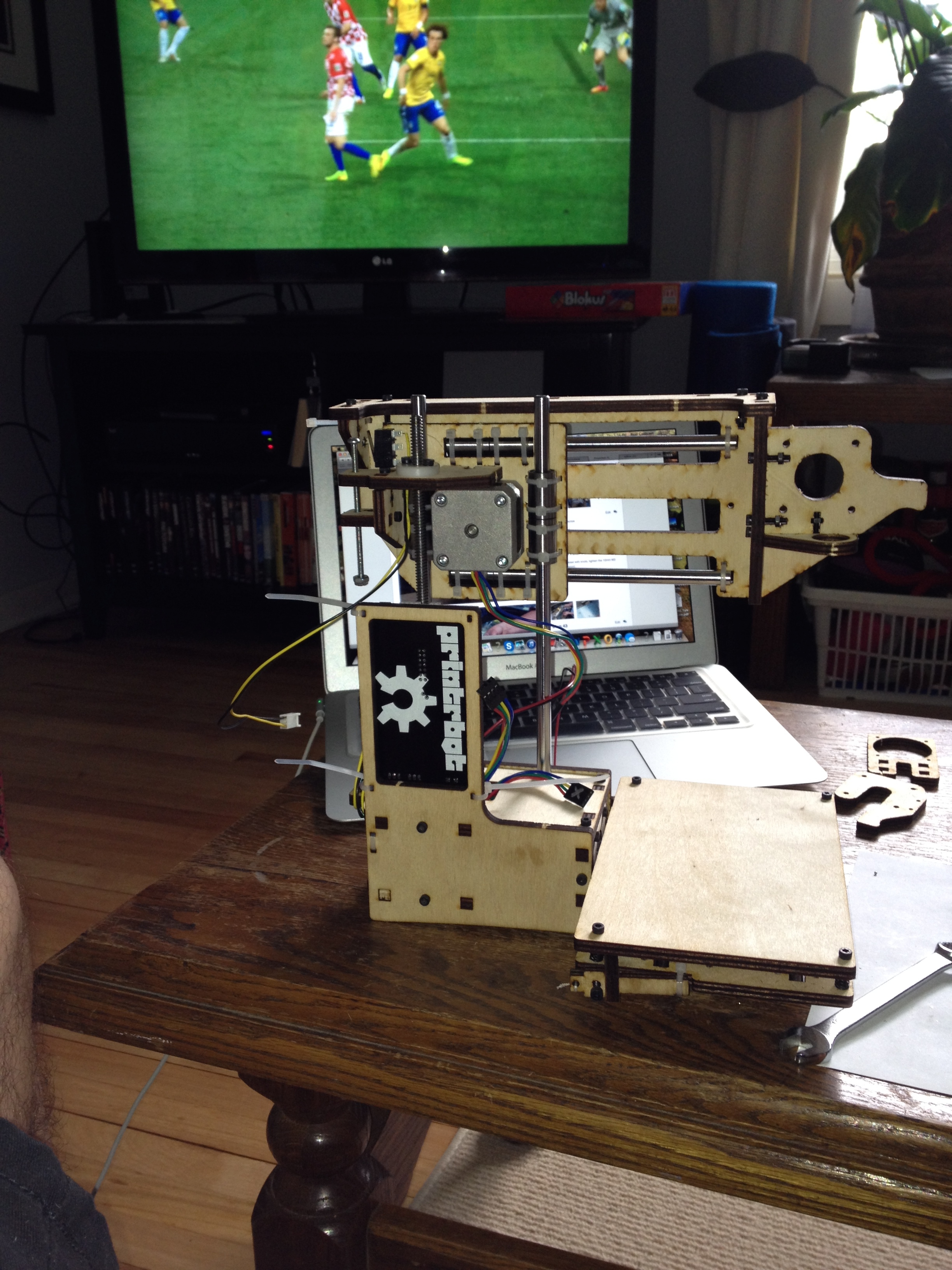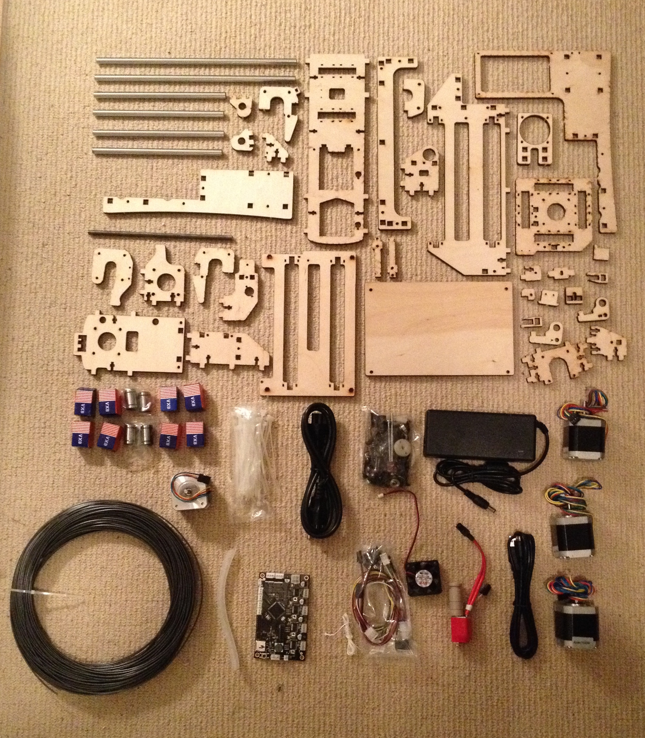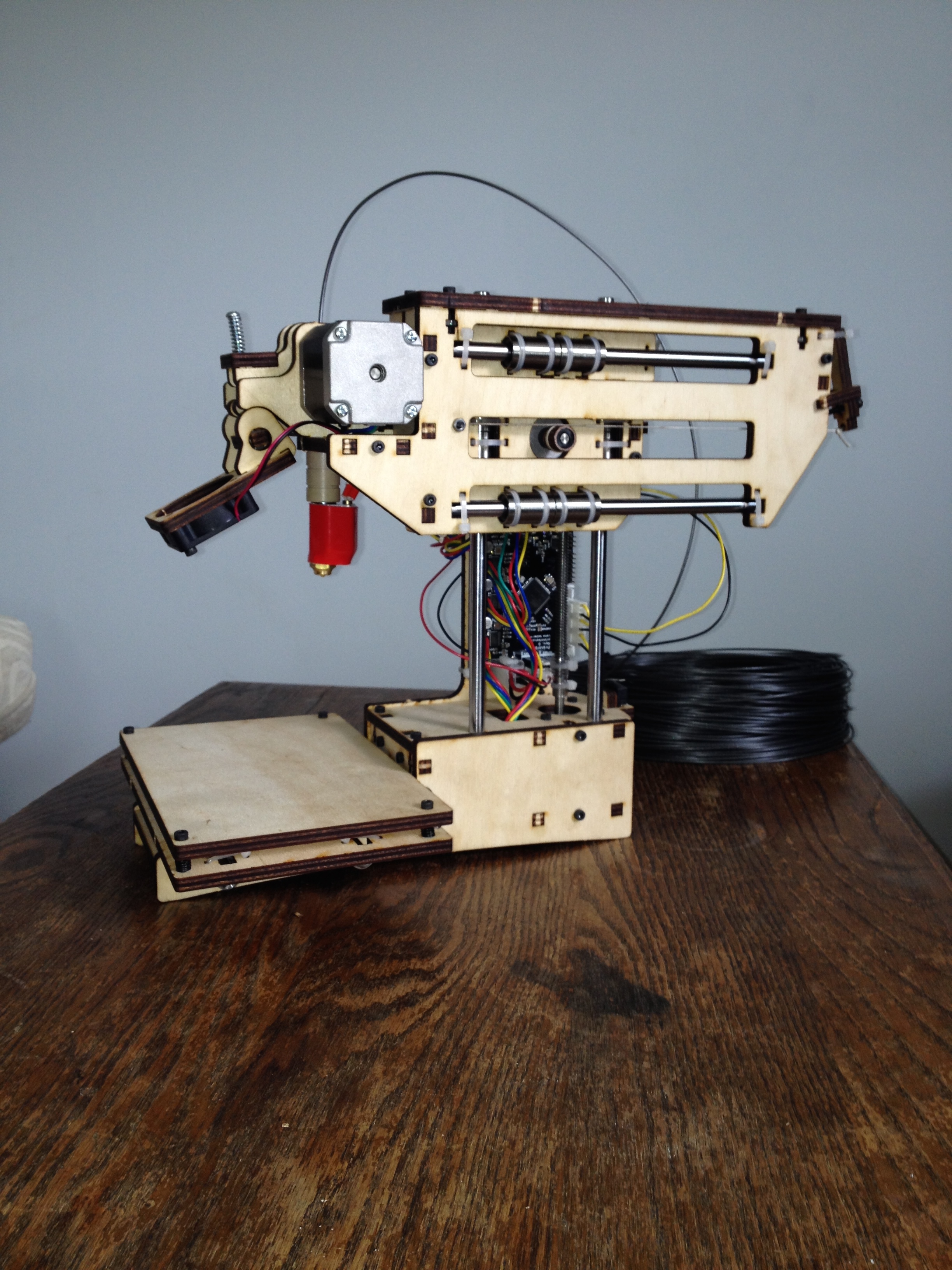 Finished printer – the spool of filament gets fed into the red extruder and melts it at 200C