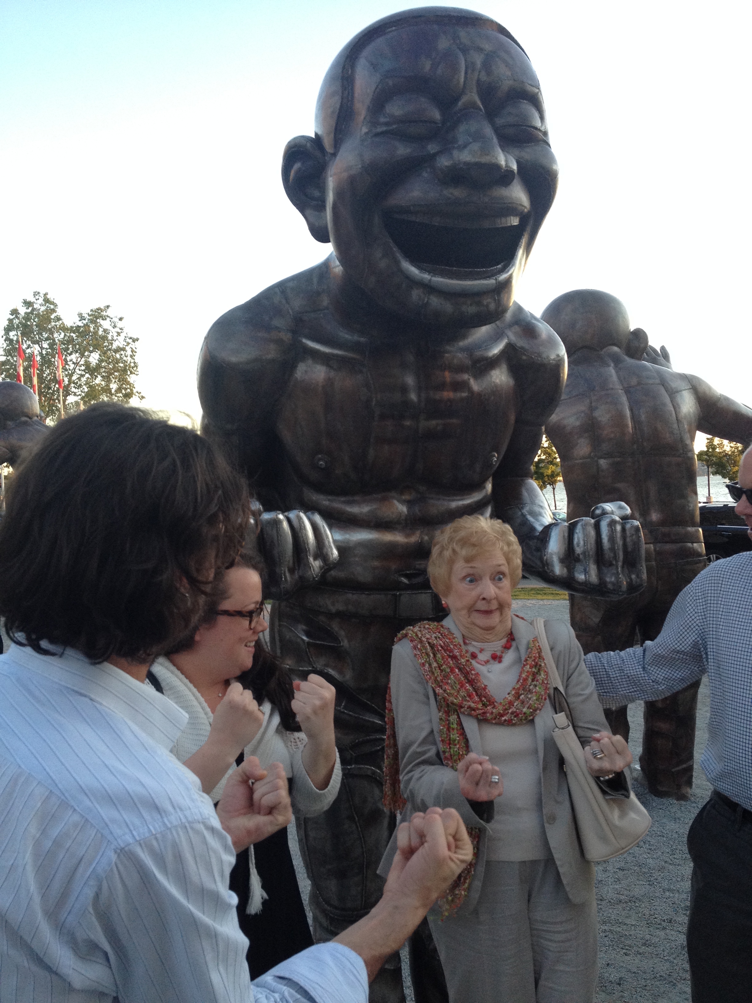 Grandy imitating a sculpture in Vancouver.